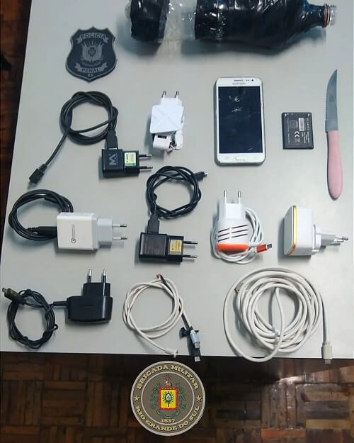 Dentro da garrafa, foram encontrados um aparelho de telefone celular, sete carregadores, além de uma faca de uso doméstico.
