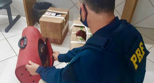 Os agentes da PRF encontraram cinco aves no banco traseiro do automóvel, sendo três galos de rinha e duas galinhas. Um dos animais estava acondicionado em uma maleta, já os demais estavam em caixas de papelão. Os animais possuíam ferimentos nas cristas, diz a corporação.
