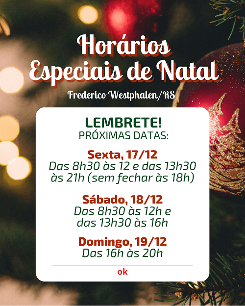 • 24/12, sexta-feira: Das 8h30 às 12h e das 13h30 às 17h