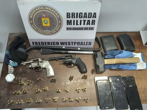 Com o quarteto foi localizado e apreendido dois revólveres, um calibre 38 e outro calibre 32, que estava na situação de roubado, além de 62 munições calibre 38, seis calibre 32, quinze calibre 9mm, uma marreta, um pé de cabra, uma talhadeira e quatro aparelhos de telefone celular contendo chip e cartão de memória.