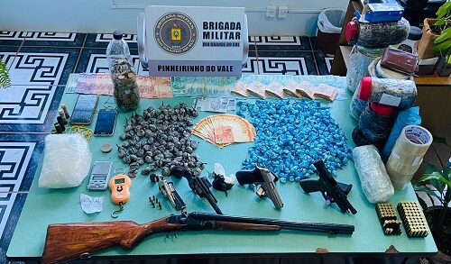 A prisão foi realizada depois de levantamento de informações pelos agentes de inteligência da Brigada Militar. Na abordagem policial foram apreendidas uma espingarda calibre 16, uma Pistola bersa calibre 9mm, uma pistola bersa thunder calibre 380, um revólver calibre 38, um revólver calibre 22, cinco cartuchos calibre 16, 117 munições de variados calibres, 602 buchas de cocaína, prontas para a venda, dois Invólucros de pasta base de cocaína, duas balanças de precisão, usadas para pesar o entorpecente, além de cinco celulares e aproximadamente R$11.300.