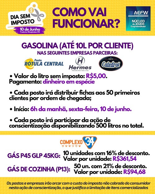 Na cidade frederiquense o “Dia Sem Imposto” é organizada pelo Núcleo do Jovem Empreendedor da Associação Empresarial de Frederico Westphalen, e acontece amanhã, sexta-feira, 10, com a participação de dez empresas locais: Supermercado Bertoletti, Posto Catedral, Complexo 34, Cotrifred, Girardi Fonoaudiologia, Posto Hermes, Supermercado Razia, Razia Express, Posto Rótula Central e Seguratel Segurança Patromonial,