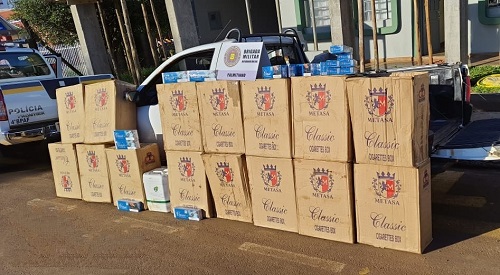 A prisão foi realizada após acompanhamento e abordagem veicular e localização de 750 pacotes de cigarros de origem estrangeira, além de um galão de agrotóxico, totalizando um prejuízo estimado em R$ 56.000,00 (cinquenta e seis mil reais) ao crime.