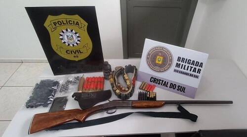 Na ação foi localizado e apreendido uma Espingarda calibre 20 e diversas munições, sendo que o proprietário da residência, um homem de 50 anos de idade, foi conduzido juntamente com o material apreendido até a Delegacia de Polícia.