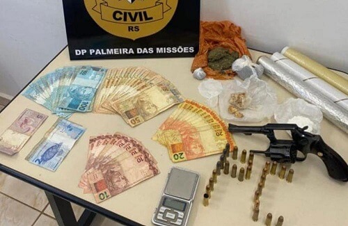 Na oportunidade, um homem, de 24 anos de idade, foi autuado em flagrante. Foram apreendidos dinheiro, drogas (crack, maconha e cocaína), arma de fogo, munições e outros objetos utilizados para a comercialização de entorpecentes.