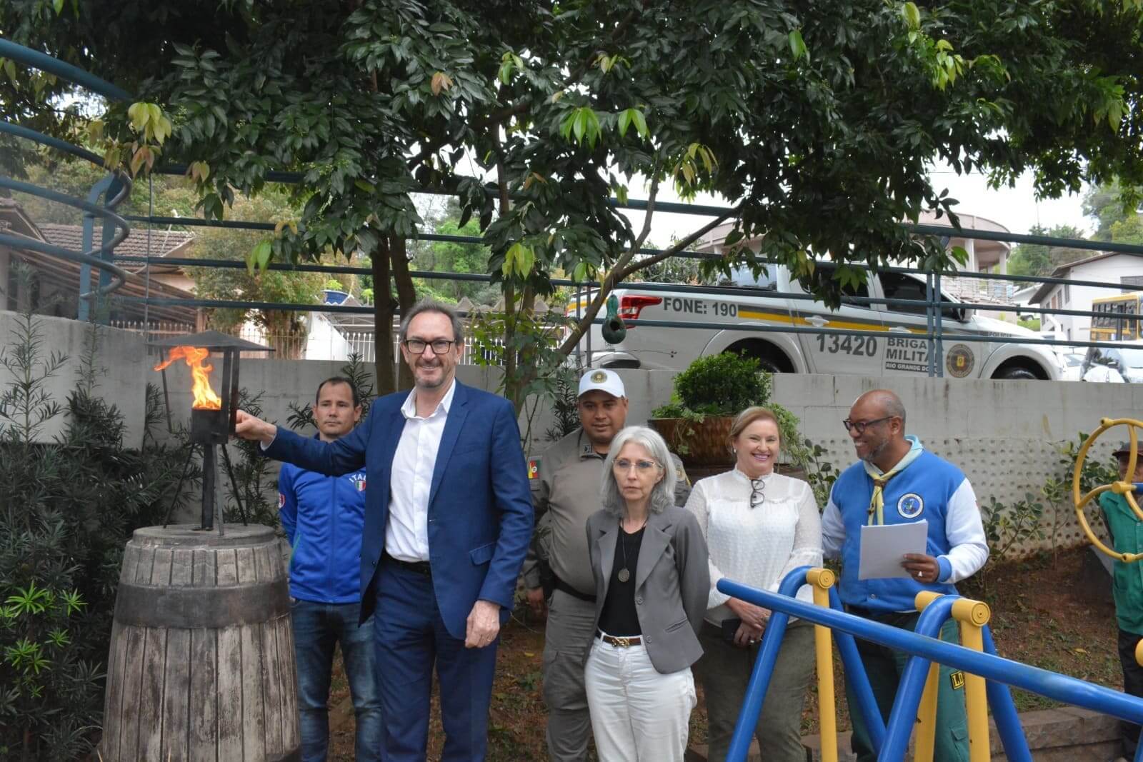 O prefeito José Alberto Panosso, junto com a secretaria da Educação e Cultura, Maria Cristina Aita, a secretaria da Administração, Marizete Frozzi, o secretário do Esporte, Renato Kreitmeier, o Dirigente Institucional da Lida da Defesa Nacional (LDN), Gilmar Souza Chagas, receberam a centelha dos representantes do 37º Batalhão de Polícia Militar. O prefeito Panosso parabenizou todos os envolvidos e reforçou a importância de ações que celebrem o amor à Pátria. Além dos secretários municipais, imprensa, representantes dos órgãos de segurança pública e a comunidade em geral, a Banda Marcial da escola Escola Municipal Irmã Odila Lehnen realizou uma belíssima apresentação no encerramento do ato.