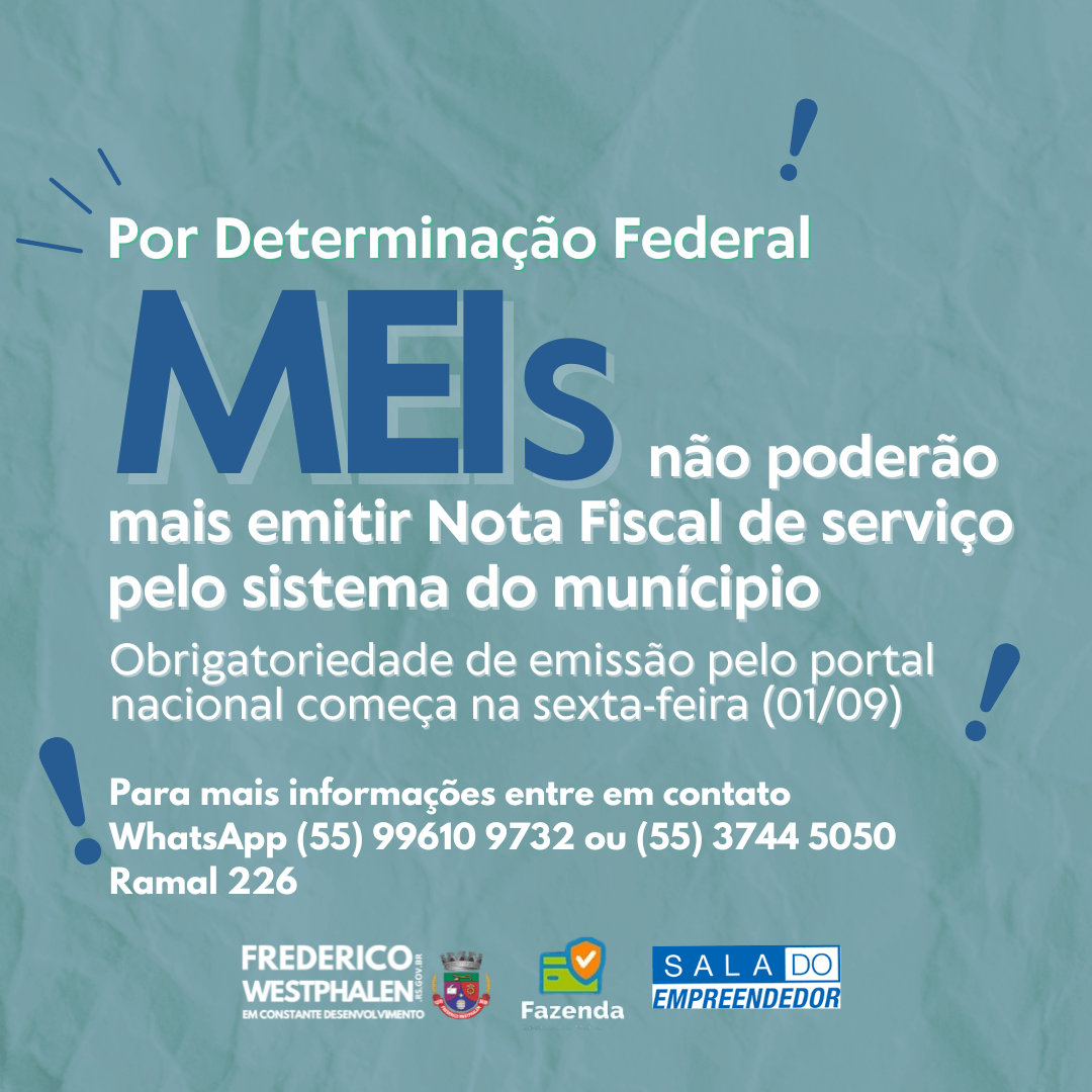 A Secretaria Municipal da Fazenda e a Sala do Empreendedor informam que a partir da próxima sexta-feira, 1º de setembro, os Microempreendedores Individuais (MEIs) deverão emitir suas notas fiscais eletrônicas pelo Portal Nacional, sem a necessidade de criação de uma senha com preenchimento de formulário (é possível também emitir as notas por aplicativo de celular). A partir desta data, não será mais possível, para os MEIs, utilizar o sistema do Município. A medida é uma determinação federal, conforme a Resolução CGSN nº 172/2023 , que busca a padronização nacional da emissão de documento fiscal de serviços do MEI, bem como a dispensa de emissão de outro documento fiscal municipal relativo ao Imposto Sobre Serviço (ISS).
