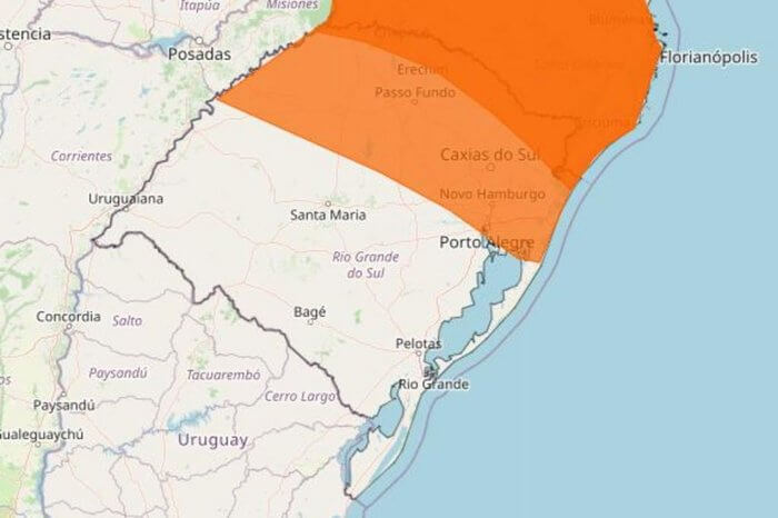 O Instituto Nacional de Meteorologia (Inmet) emitiu dois alertas laranjas para risco de temporal no Rio Grande do Sul neste fim de semana. O primeiro vale das 00h01 às 23h59min de sábado e o segundo das 00h às 23h59min de domingo. Já o marcador de sábado destaca áreas como o Norte, a Serra, o Litoral Norte e parte do Noroeste e da Região Metropolitana. Já o alerta de domingo destaca apenas as áreas da fronteira com Santa Catarina.