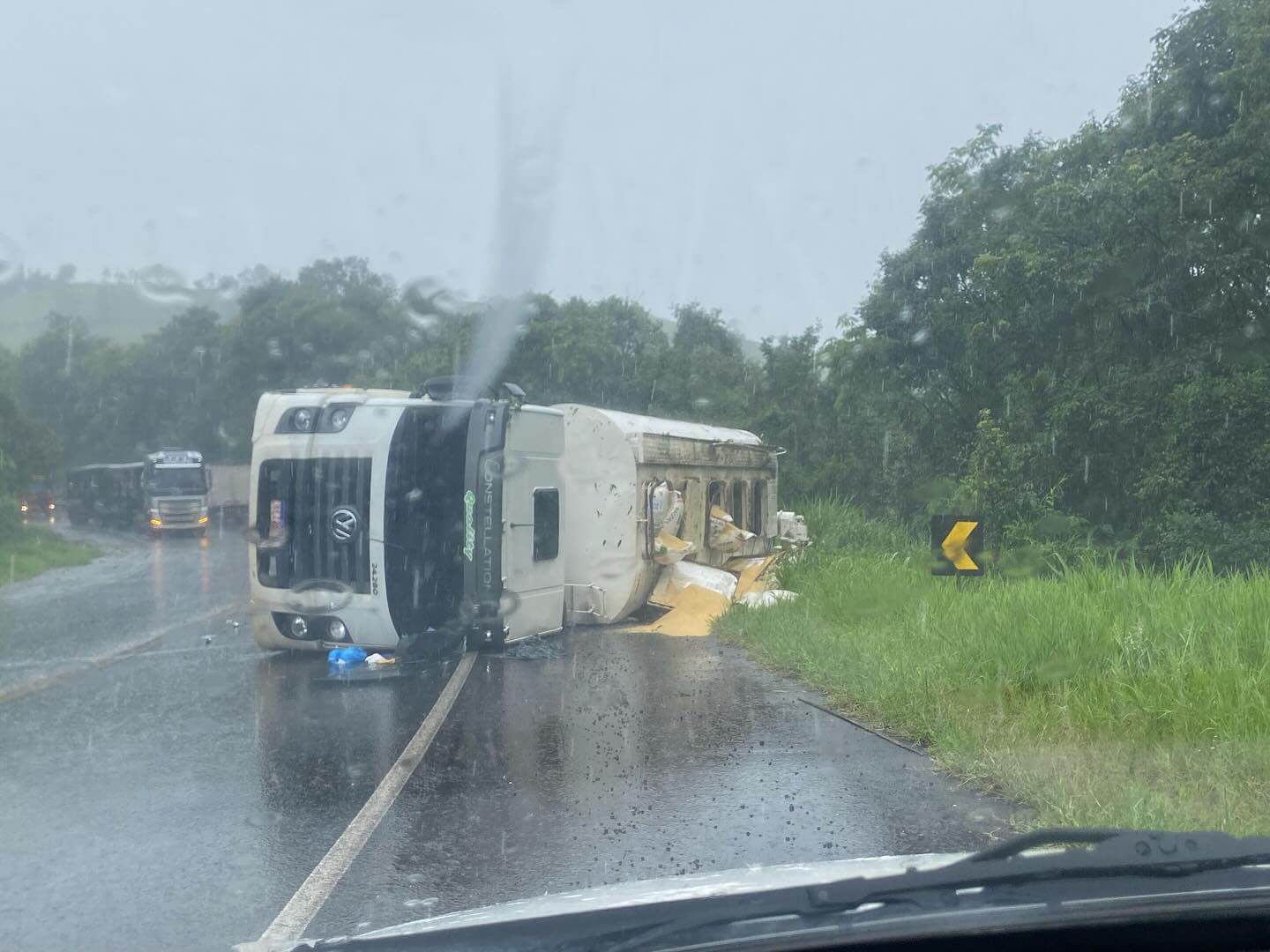Os motoristas devem redobrarem os cuidados ao passar pelo local já que a via está parcialmente interrompida devido ao veículo estar sobre a pista
