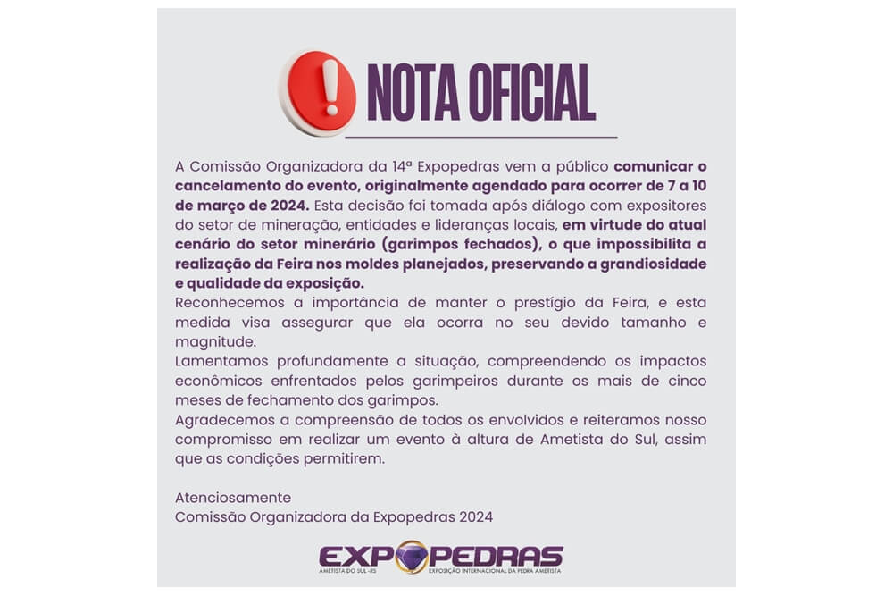 - "Uma decisão difícil de ser tomada, mas foi necessário. Não temos condições de realizar esse evento que tanto representa para nosso Município, sendo ele um retrato da mineração local, na situação que nossos garimpeiros estão, sem trabalhar a tanto tempo. Esperamos que a comunidade compreenda o momento e que possamos fazer um evento ao porte que Ametista do Sul merece em um momento mais oportuno", comentou o prefeito Jadir.