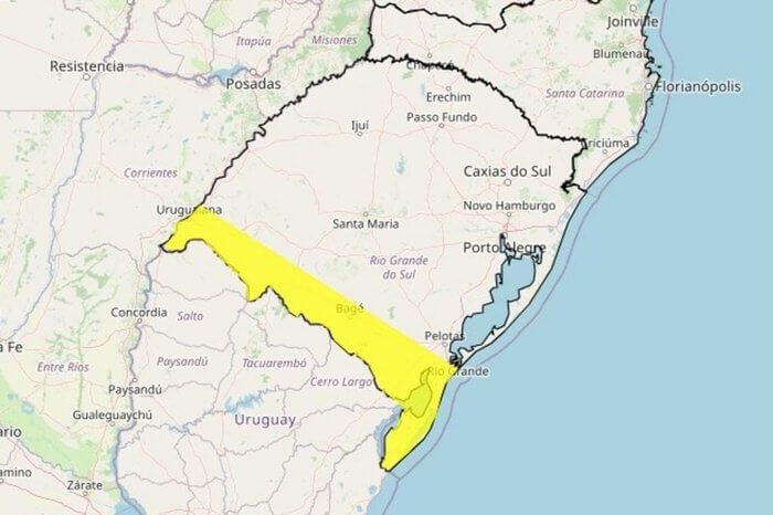 O alerta do Inmet aponta “perigo potencial” para queda de granizo, ocorrência de, pelo menos, 20 milímetros de chuva em uma hora - ou 50mm/dia - na região e vento que pode variar entre 40 e 60 quilômetros. Ao menos 24 municípios do Estado, todos próximo à fronteira do Uruguai, devem ser atingidos.