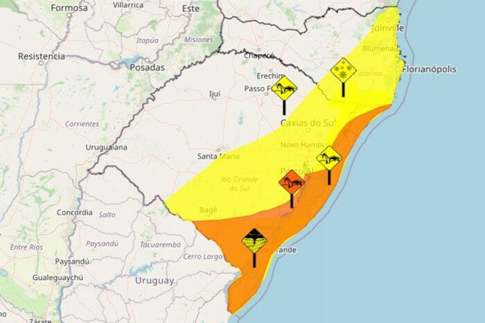 Também amarelo, o alerta de neve iniciou às 5h e ficará vigente até o meio-dia, indicando a possibilidade de espessura de até 5 cm. O aviso abrange nove municípios, sendo apenas dois do Rio Grande do Sul – Bom Jesus e São José dos Ausentes – e o restante de Santa Catarina.