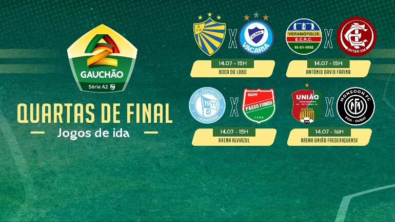 Os duelos das quartas de final da competição estão definidos e as equipes entram em campo neste domingo (14), pelos jogos de ida. Às 15h, a bola rola para Pelotas x Glória, na Boca do Lobo; Lajeadense x Passo Fundo, na Arena Alviazul e Veranópolis x Inter-SM, no Antônio David Farina. Às 16h, União-FW x Monsoon completam a rodada, na Arena União Frederiquense.