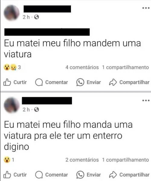 "Eu matei meu filho, mandem uma viatura para ele ter um enterro digno", escreveu no post. Confira abaixo.