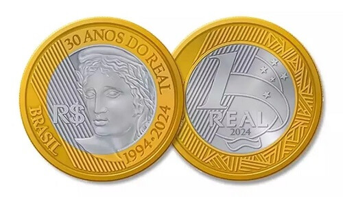 – Na borda dourada, constam as legendas “30 Anos do Real”, “1994-2024” e “Brasil”.