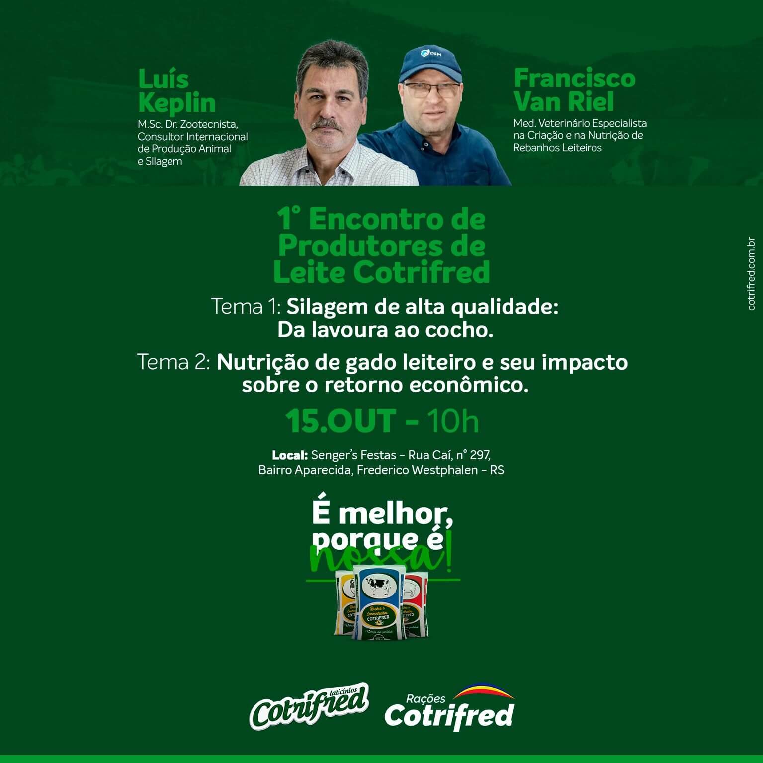 No dia 15 de outubro, a Cotrifred estará realizando o 1º Encontro de Produtores de Leite. O evento terá início às 10h e será realizado no Centro de Eventos da Senger’s, em Frederico Westphalen.
