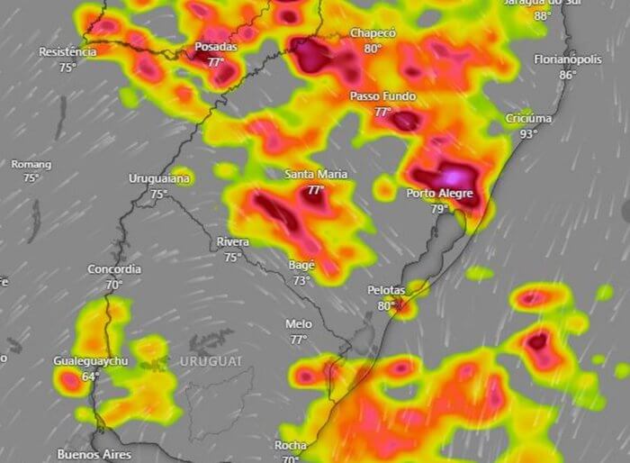 O fenômeno avança em direção ao Oceano Atlântico, com vento forte e um sistema de baixa pressão atmosférica que favorece a formação de nuvens carregas de chuva. No sistema de monitoramento atmosférico Windy é possível observar o ciclone sobre o Uruguai, próximo da Fronteira Oeste, e a projeção da tempestade no território gaúcho.