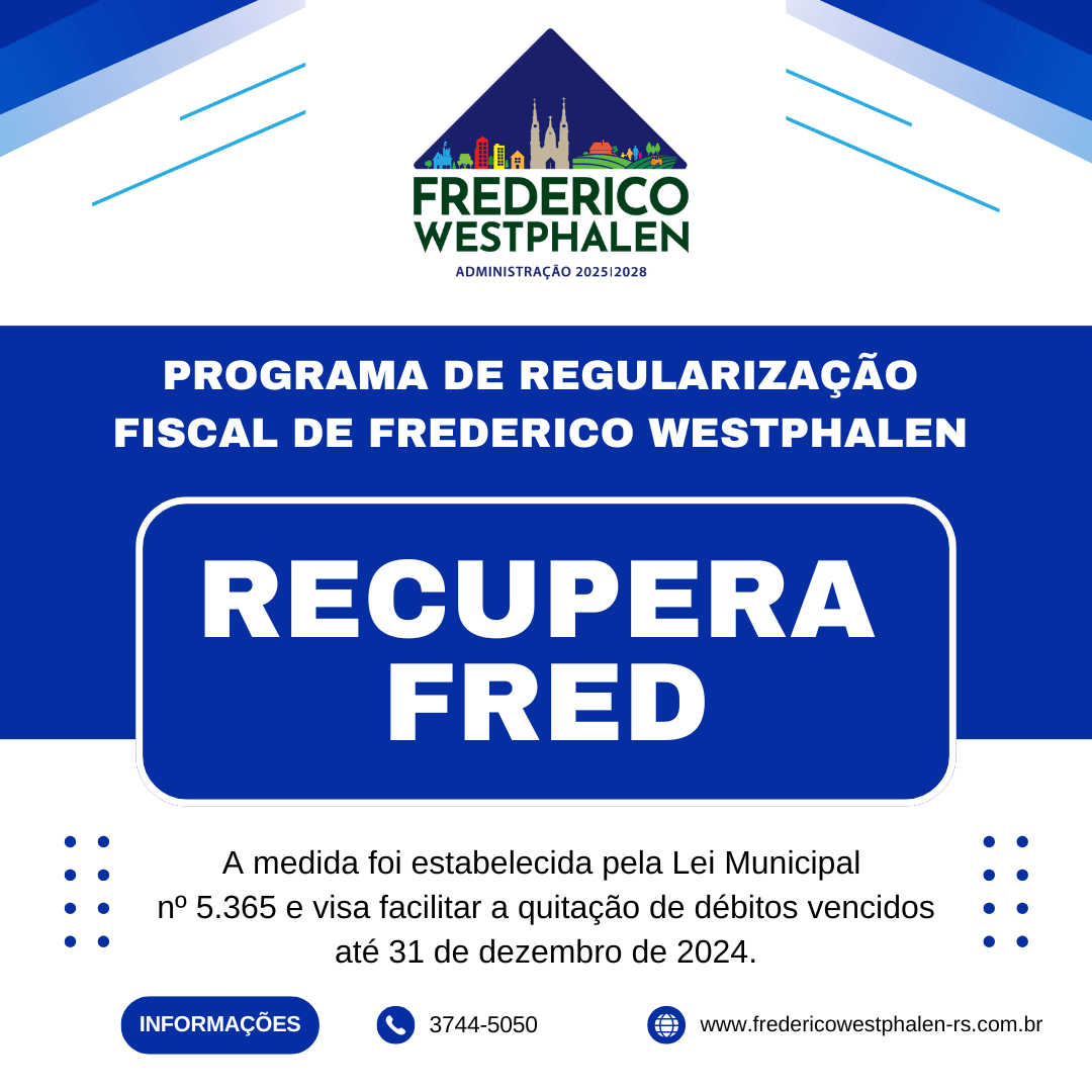 A Prefeitura de Frederico Westphalen lançou o programa RECUPERA FRED, uma iniciativa voltada para a regularização de créditos de natureza tributária e não tributária. A medida, que foi estabelecida pela Lei Municipal nº 5.365, visa facilitar a quitação de débitos vencidos até 31 de dezembro de 2024, tanto para pessoas físicas quanto jurídicas do município.