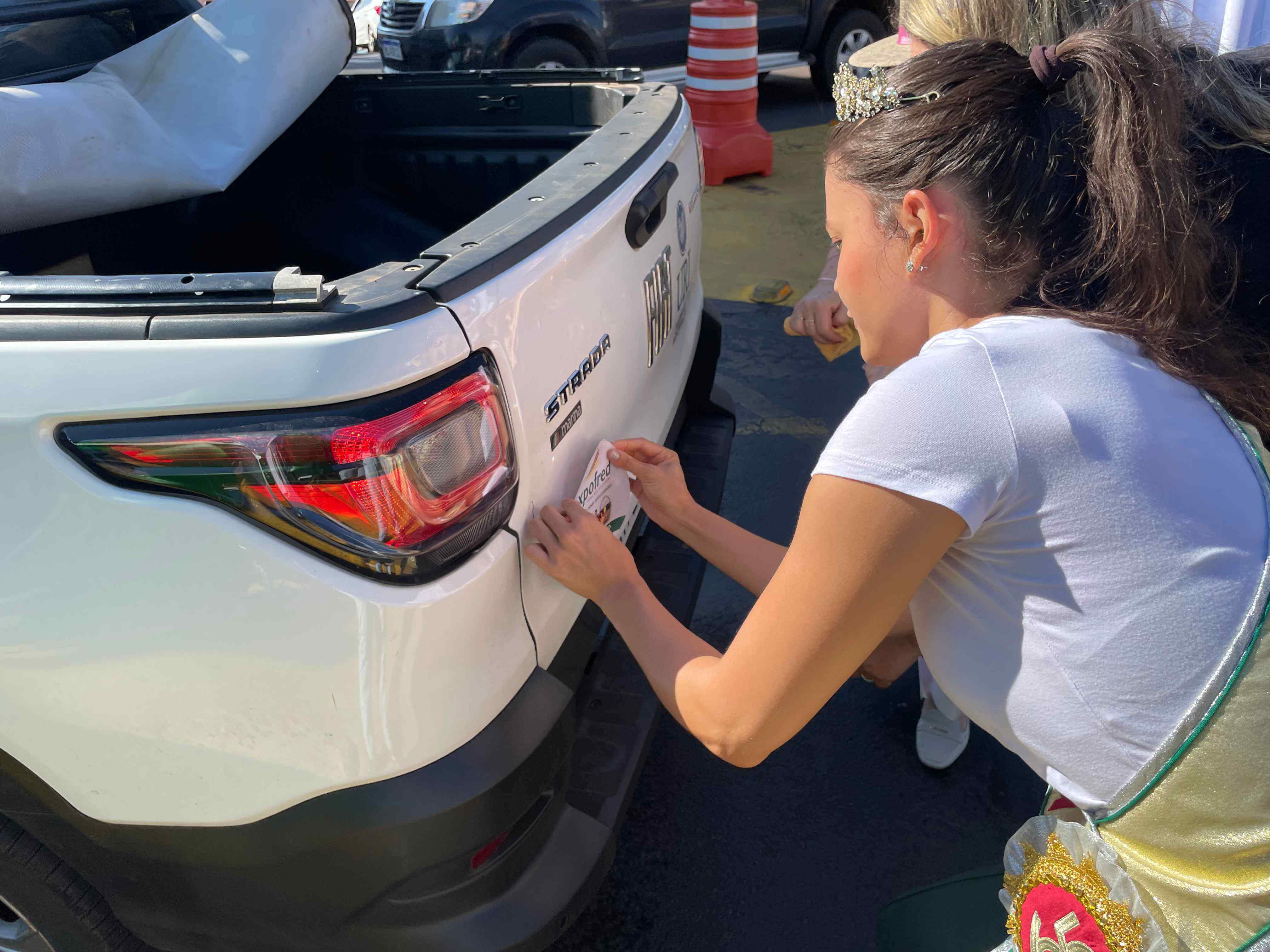 Mais de 350 veículos foram adesivados durante a manhã intensiva de trabalho que contou com a presença de membros da Comissão Setorial e a Corte de Soberanas, as princesas Bruna Karoline e Laura Rippel, que distribuíram folders informativos das feira, reforçando o convite à comunidade e destacando as principais atrações.