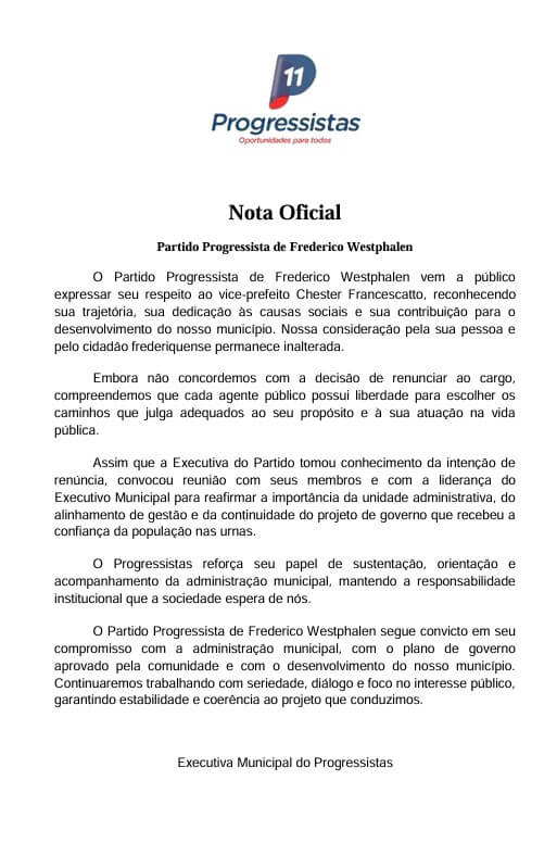 Em nota o Progressistas lamentou a decisão tomada, mas diz seguir convicto em seu compromisso com a administração municipal.