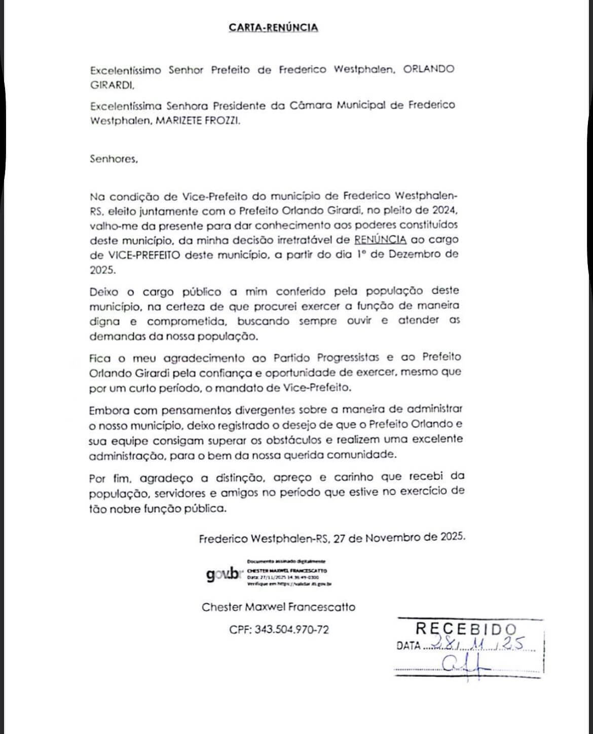 Uma notícia que pegou a comunidade de surpresa foi a renúncia do então vice-prefeito, Chester Francescatto, ao seu cargo na administração municipal de Frederico Westphalen. O burburinho começou a ganhar força na metade da tarde desta sexta-feira, 28, e foi confirmada através da obtenção da carta de renúncia de Chester. Figura conhecida e reconhecida por sua índole, ele deixa o cargo agradecendo ao seu partido Progressistas e ao prefeito Orlando Girardi.