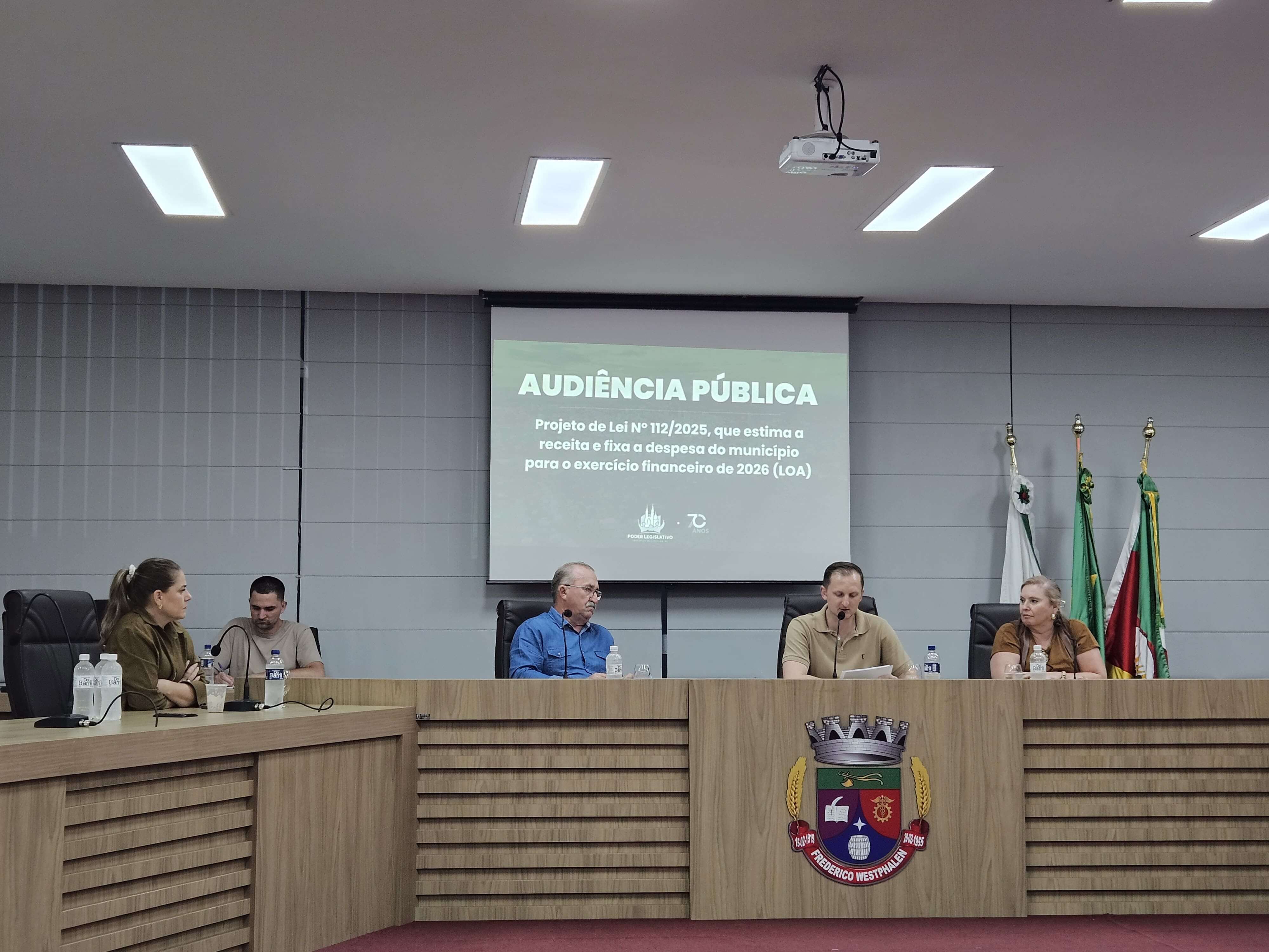 O Poder Legislativo de Frederico Westphalen, por meio Comissão de Desenvolvimento Econômico, Fiscalização e Controle Orçamentário (CDEFCO), realizou na segunda-feira, 01, no Plenário Hilário Piovesan, uma Audiência Pública para debater a Lei Orçamentária Anual (LOA) para o exercício financeiro de 2026. A audiência foi presidida pelo presidente da comissão, vereador Leandro Mazzutti, e contou com as presenças da presidente da Câmara, Marizete Frozzi; do vereador Lídio Pedro Signori e da vereadora Rubia Dal Puppo Maas.