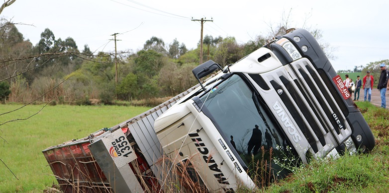 Um caminhão vazio utilizado no transporte de frango tombou na RSC-472, em Tenente Portela na manhã desta segunda-feira, 14 de agosto.