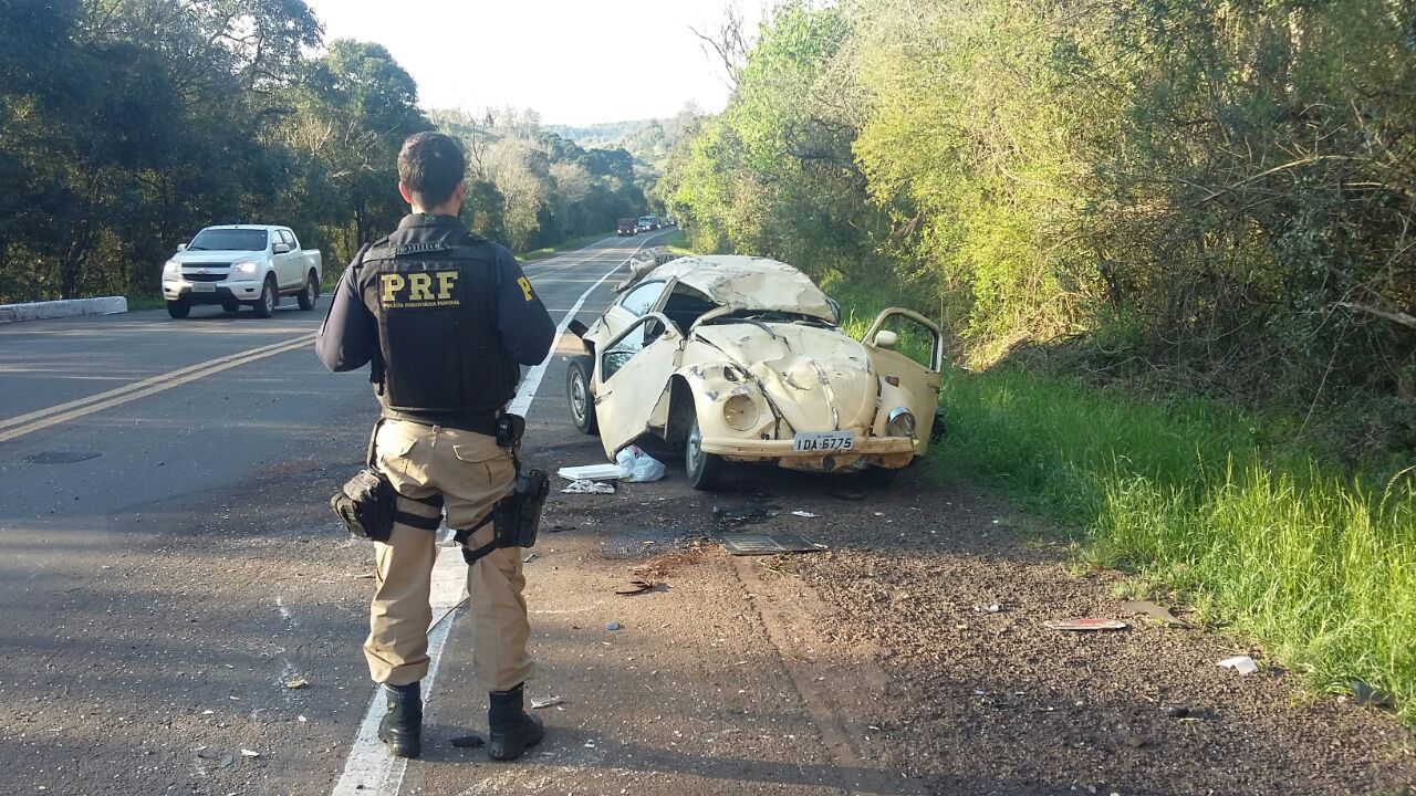 Os policiais foram acionados após uma ligação informando sobre um capotamento no km 152, próximo a um posto de combustíveis. O Fusca, com placas de Viamão/RS, ficou sobre uma pista.