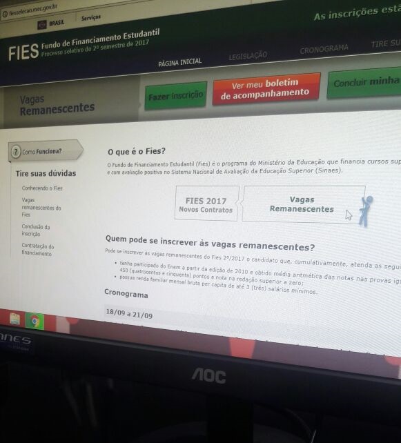 O Ministério da Educação abriu nesta segunda-feira (18) as inscrições para 35 mil vagas remanescentes do Fundo de Financiamento Estudantil (Fies) referentes ao segundo semestre de 2017. Os prazos variam conforme a modalidade em que o estudante se encaixa.