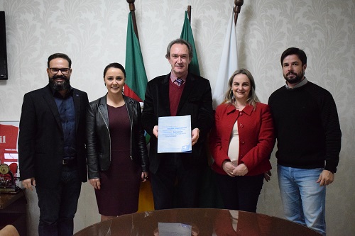 Na manhã desta segunda-feira, 25, foi assinado o termo que estabelece o convênio entre a Administração Municipal e o Sebrae, para a instalação da Sala do Empreendedor no município. Na ocasião, estiveram presentes o prefeito José Alberto Panosso, o vice, Diogo Duarte, os Secretários Municipais e os representantes do Sebrae, a gerente regional da entidade, Silvana Berguemmaier, e o técnico da Regional Norte do Sebrae, Patric Strapazzon.