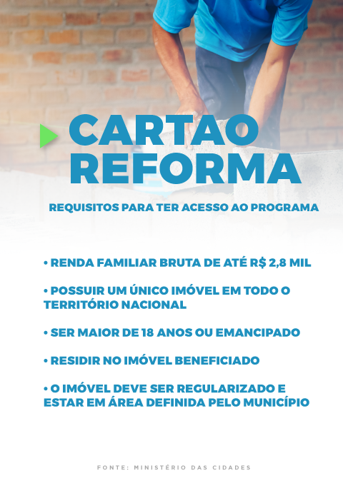 Famílias com renda de até R$ 2,8 mil podem ter acesso a subsídios para reformar, ampliar ou concluir a casa. Esses recursos são liberados por meio do programa Cartão Reforma, que é operado pela Caixa Econômica Federal. O lojista que participa, vende os materiais e depois é reembolsado.