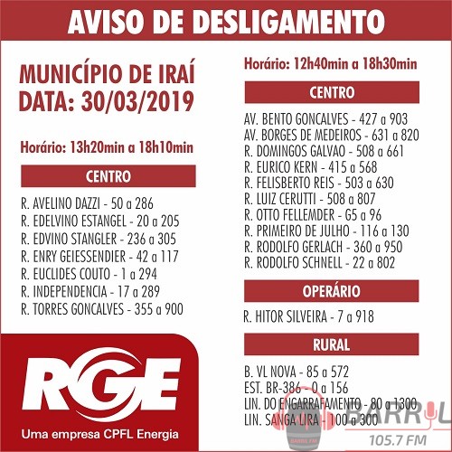 Devido ao Programa de Expansão e Melhoramento do Sistema de Distribuição de Energia Elétrica, o fornecimento de energia será interrompido em algumas localidades do município de Iraí neste sábado, 30, e domingo, 31.