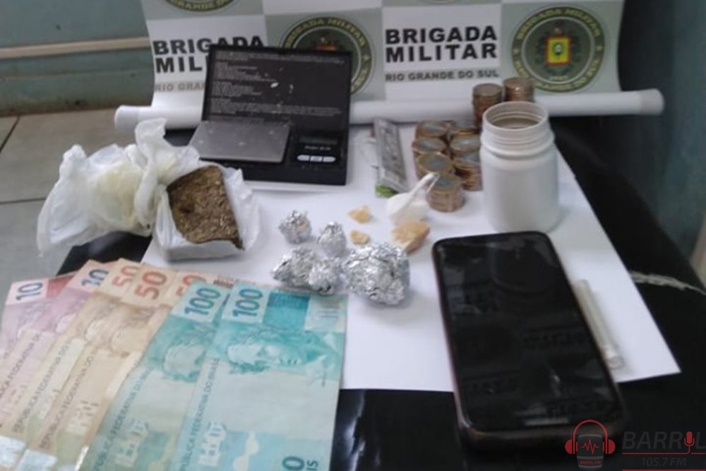 Na ação, foram apreendidos cocaína, crack, maconha e uma quantidade em dinheiro, sendo ainda constatado que um dos homens estava com mandado de prisão em aberto. Ambos foram conduzidos até a Delegacia de Polícia Civil para lavratura do flagrante.