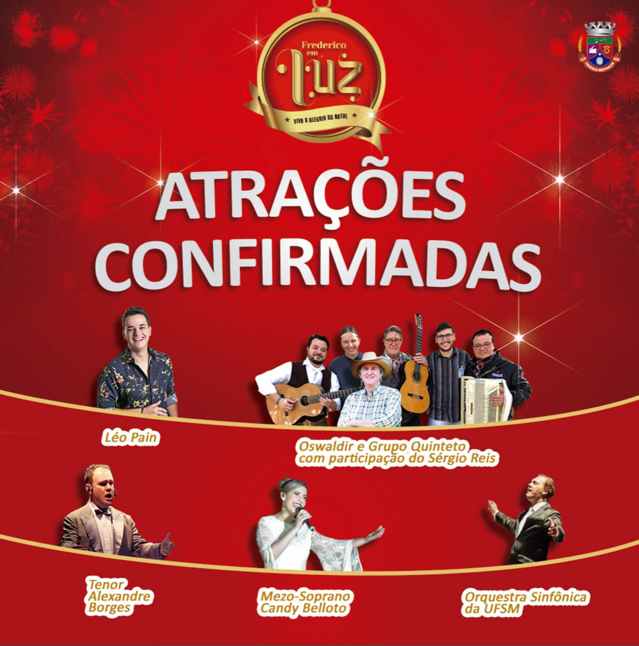 Considerado um dos maiores eventos natalinos da região, o Frederico em Luz continuará com a Árvore Cantante, com o Coral da Uri, além das apresentações de bandas marciais. O que terá de novidade são as atrações nacionais como Léo Paim, Oswaldir (ex-dupla Oswaldir e Carlos Magrão) e Grupo Quinteto Nativo com a participação especial de Sérgio Reis.