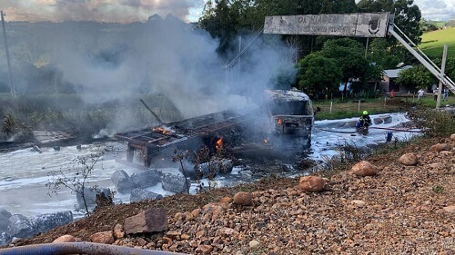 Caminhão com carga de tintas pega fogo na entrada de Palmitinho